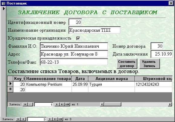 Форма «ПОСТАВЩИК»