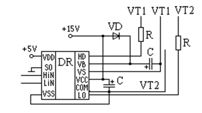 Транзисторный модуль М2ТКИ-50-12 управляется специализированным драйвером - драйвер транзисторных модулей такого типа - IR2112 фирмы InternationalRectifier. Драйвер способен выдерживать напряжения до 600 вольт. Схема включения приведена ниже: