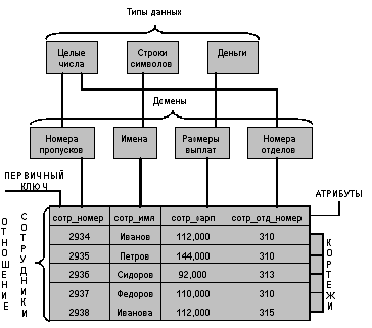 Основными понятиями реляционных баз данных являются тип данных, домен, атрибут, кортеж, первичный ключ и отношение.