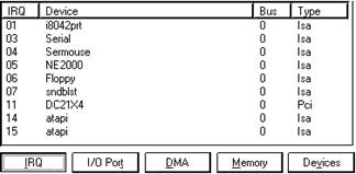 Надо запустить программу winmsd.exe, входящую в поставку WindowsNT "Start" или "Пуск" для русской версии "Run" или "Выполнить" набрать winmsd нажать ENTER В появившемся окне выбрать закладку "Resources" Появится список используемых прерываний. Например такой: