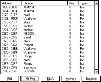 Выбрав "I/O Port" можно посмотреть используемые адреса ввода вывода.