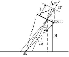 Элементу dS на поверхности наблюдения соответствует элемент dS¢ в картинной плоскости. Так как проективное преобразование оптической системы является центральным, то угол dw, опирающийся на площадку dS, равен углу dw¢ в пространстве изображений. Отсюда следует