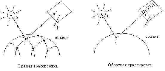 При прямой трассировке за исходную позицию берется вычисляемая на изображаемой поверхности точка 1, из нее моделируется путь луча на источник света 2 и на приемник изображения - точка 3.