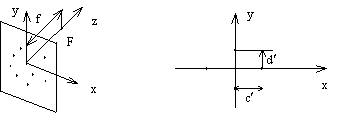 По аналогии c физическими устройствами ось z соответствует главному лучу объектива, плоскость xy - задней фокальной плоскости, а центр проекции F располагается на оси OZ в точке (0,0,f) и сопоставляют с задней главной точкой объектива.