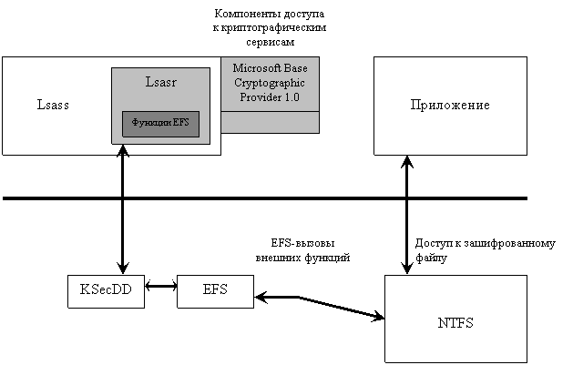 EFS реализована в виде драйвера устройства, работающего в режиме ядра и тесно связанного с драйвером файловой системы NTFS. Всякий раз, когда NTFS встречает зашифрованный файл, она вызывает функции из драйвера EFS, зарегистрированные им в NTFS при инициализации EFS. Функции EFS осуществляют шифрование и расшифровку файловых данных по мере обращения приложений к шифрованным файлам. Хотя EFS хранит FEK вместе с данными файла, FEK шифруется с помощью открытого ключа индивидуального пользователя. Для шифрования или расшифровки файловых данных EFS должна расшифровать FEK файла, обращаясь к криптографическим сервисам пользовательского режима.