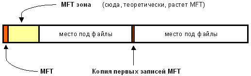 Диск NTFS условно делится на две части. Первые 12% диска отводятся под так называемую MFT зону - пространство, в которое растет метафайл MFT (об этом ниже). Запись каких-либо данных в эту область невозможна. MFT-зона всегда держится пустой - это делается для того, чтобы самый главный, служебный файл (MFT) не фрагментировался при своем росте. Остальные 88% диска представляют собой обычное пространство для хранения файлов.
