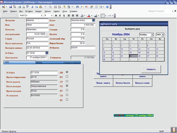 Внешний вид формы «Пассажиры»