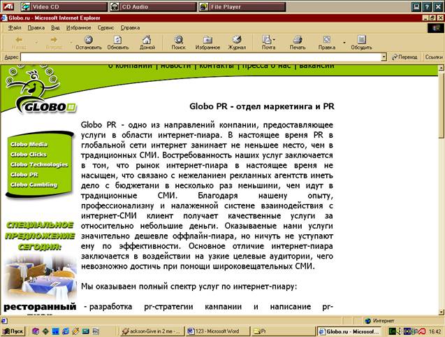 Этот сайт (http://www.globo.ru/) является полезным для тех, кто нуждается в таких услугах по Internet-PR: