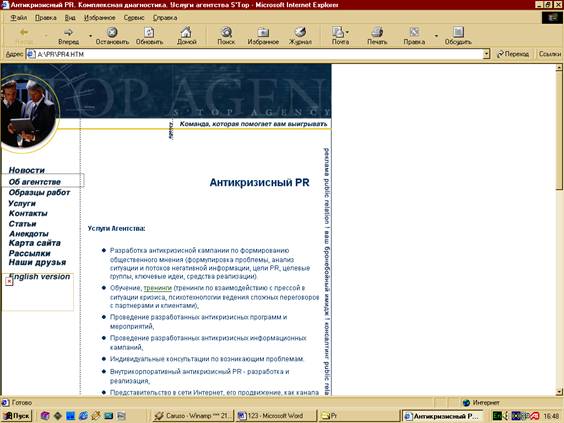 Наличие автомобиля, мобильного телефона или факса уже не говорит о его владельце, как о деловом и преуспевающем бизнесмене не говоря уже о "новичках". Век технологий диктует свои правила и они гласят: "У преуспевающей фирмы должно быть собственное лицо в интернете". Реклама на радио и телевидении доступна пока не всем, интернет - альтернативное решение в сфере рекламных компаний для вашего бизнеса. Однако качественный продукт требует индивидуального подхода и нестандартных решений. Если Вы созрели для создания и размещения интерактивного представительства Вашей компании в Интернете, зайдите на сайт (http://www.prstudio.ru/) .