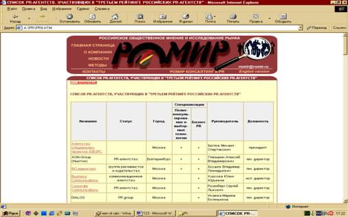 Если перед Вами стоит задача проанализировать PR-агентства, обратитесь к материалам данного сайта (http://romir.ru/) . Кроме того, этот сайт будет полезен тем, кто нуждается в помощи PR-агентств.