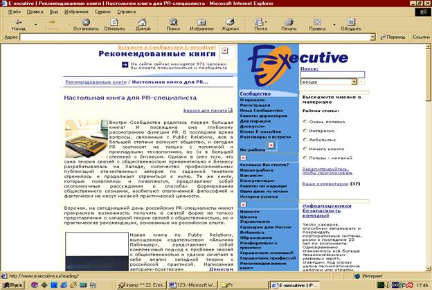 Этот сайт (http://www.e-xecutive.ru/) станет настольной книгой PR-специалиста, так как он посвящен глубокому рассмотрению функции PR. В последнее время вопросы, связанные с Public Relations, все в большей степени волнуют общество, и сегодня PR соотносят не только с политикой и прикладными технологиями, но (и в большей степени) с бизнесом.
