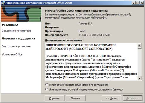 · В следующем окне программа установки (рисунок 2) предложит вам принять условия лицензии, определяющие ваши права в отношении устанавливаемой копии Excel 2000. Если мы хотим продолжить установку, вам необходимо эти условия принять, выбрав опцию I accept the terms in the License Agreement.