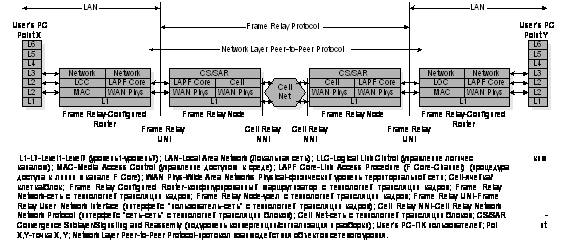 Примеры подобных архитектур будут приведены позже. Например, на рис. 1 можно наблюдать интеграцию протоколов FR и ATM (в силу своей эффективности, наиболее распространенный случай). В данном случае сеть ATM предоставляет виртуальный свободный от ошибок канал связи.
