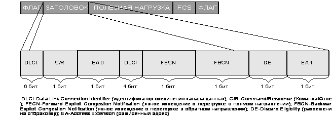 Кадр имеет различную длину, а заголовок коммутируемого кадра содержит 10-битовый номер, идентификатор соединения канала данных (Data Link Connection Identifier — DLCI).