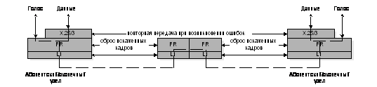 Для передачи данных, помимо механизмов FR магистральной сети, на абонентской стороне задействованы дополнительные протоколы, в данном случае X.25. Они обеспечивают за счет повторной передачи пакетов, в которых обнаружены ошибки, гарантированное доведение данных на уровне абонент-абонент, то есть осуществляют функции протокола транспортного уровня семиуровневой модели взаимодействия открытых систем OSI (этот механизм рассмотрен в пункте ‘Механизм управления потоками’).