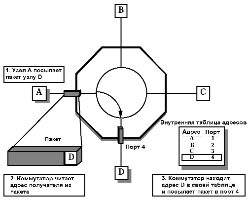 Используя таблицу адресов и содержащийся в пакете адрес получателя, коммутатор организует виртуальное соединение порта отправителя с портом получателя и передает пакет через это соединение. На рисунке 1 узел А посылает пакет узлу D. Найдя адрес получателя в своей внутренней таблице, коммутатор передает пакет в порт 4.