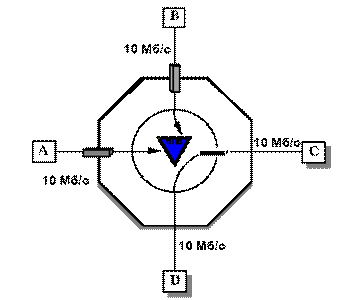 Одновременные соединения. В коммутаторах передача данных между любыми парами портов происходит независимо и, следовательно, для каждого виртуального соединения выделяется вся полоса канала. Например, коммутатор 10 Mbps на рисунке 5 обеспечивает одновременную передачу пакета из A в D и из порта B в порт C с полосой 10 Mbps для каждого соединения (рис.2).