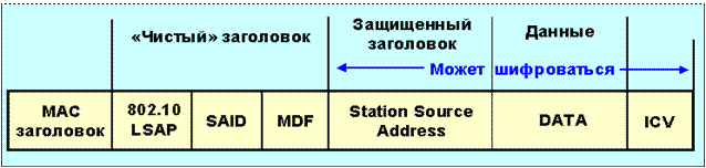 Поле чистый заголовок включает в себя три субполя. MDF (Management Defined Field) является опционным и содержит информацию о способе обработки PDU. Четырехбайтовое субполе said (Security Association Identifier) - идентификатор сетевого объекта (VLAN ID). Субполе 802.10 LSAP (Link Service Access Point) представляет собой код, указывающий принадлежность пакета к протоколу vlan. Предусматривается режим, когда используется только этот заголовок.