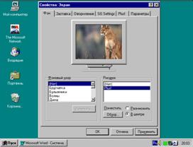 В меню Пуск выберете пункт Настройка, в следующем подменю, щелкните на команде Панель управления, в появившемся диалоговом окне выберете значок Экран и дважды щелкните по нему мышью. Раскроется диалоговое окно Свойства: Экран. В этом окне на вкладке Фон, вы сможете выбрать Фоновой узор и Рисунок для фона из соответствующих списков. * Монитор *, в верхней части окна, покажет результат вашего выбора. В группе Рисунок вы можете выбрать способ размещение фонового рисунка. На вкладка Заставка из одноименного списка, вы можете выбрать одну из предлагаемых заставок. Щелчок на кнопке Просмотр позволит увидеть результат выбора. В полях Интервал и Параметры - соответствующие настройки заставки.