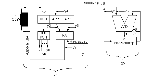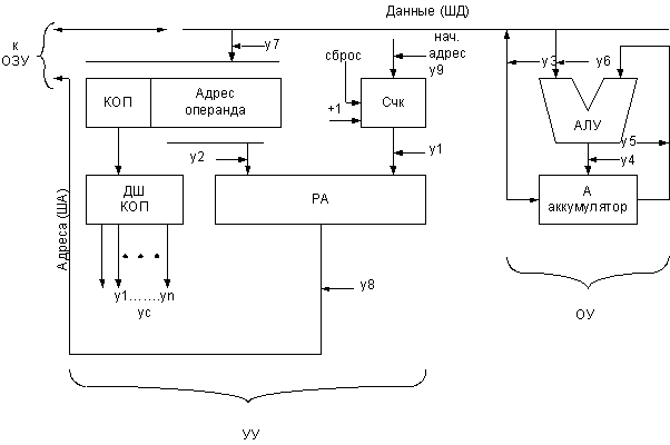 Процесс выполнения команд процессором следующий: в начальный момент в регистр команд (РК) заносится адрес первой выполняемой команды (по сигналу “Сброс” или “Пуск” или каким либо иным способом). По этому адресу считываются команда, которая содержат код операции (КОП), адрес операнда (Аоп), а так же адрес следующей команды (Аск). Поле КОП команды поступает на схему формирования управляющих сигналов (ДшКОП- дешифратор КОП) которая вырабатывает нужную последовательность управляющих сигналов y1 .yn, необходимых для выполнения команды в процессоре.