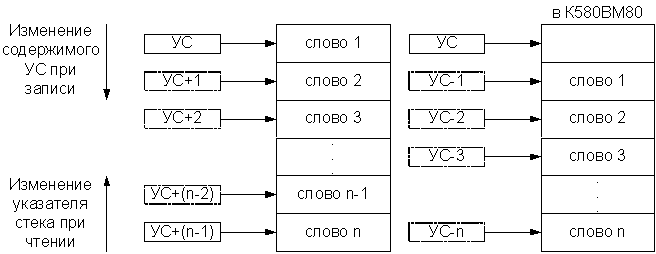 Магазинная (стековая) память организуется по принципу “последний пришел, первый вышел” (LIFO), или “первый пришел, первый вышел” (FIFO). Такая организация памяти является фактически безадресной. Однако регистр адреса в такой памяти имеется и называется указателем стека (УС) (SP-Steak Pointer). Принцип организации стековой памяти показан на рисунке 3.5.1.