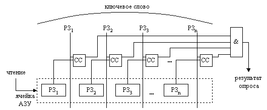 Каждая ячейка такого АЗУ должна содержать (см. рисунок 3.6.1) регистр для хранения слова данных (как в обычных ОЗУ) и специальные комбинационные логические схемы для сравнения текущего содержимого регистра с ключевым словом, поступающим одновременно на вход всех ячеек. При поиске формируется сигнал чтения из всех ячеек АЗУ. Импульс опроса появится на выходе ячейки, в которой содержимое совпадает с ключом.