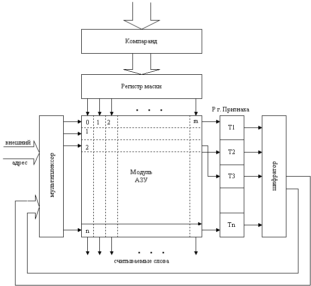 Перед началом работы информация заносится в регистр, называемый компарандом (операнд в операции сравнения). Каждая ячейка связана с процессором через регистр признаков (Рг.Пр) с помощью разряда Тj.Регистр признака называют памятью отклика. Регистр маски маскирует те разряды компаранда, которые не должны участвовать в операции сравнения.