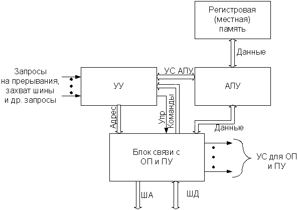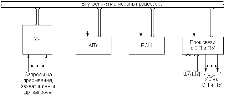 В обеих структурах в УУ входят регистр команд, счетчик команд, схема управления прерываниями, регистр состояния процессора, дешифратор команд, устройство выработки последовательности сигналов, управляющих ходом выполнения команд в АЛУ и другие устройства.