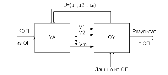 На приведенном рисунке Y={y1,y2… yn}-множество функциональных сигналов, управляющих ходом выполнения операций. Каждый функциональный сигнал соответствует выполняемой микрооперации на некотором такте работы ЭВМ. U={u1, u2… un}- сигналы, оповещающие о ходе выполнения операции.