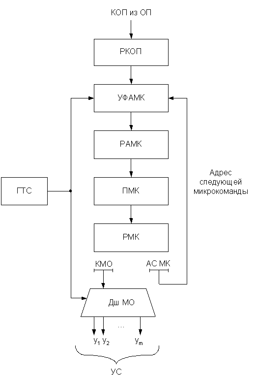 КМО дешифрируется и преобразуется в набор управляющих сигналов y1…ym, управляющих функционированием процессора. Адрес следующей микрокоманды поступает в УФАМК, в ркезультате чего производится выборка следующей МК.