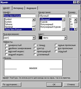 Наиболее полный набор инструментов для работы со шрифтами предоставляет в ваше распоряжение окно диалога “Шрифт”. С помощью этого окна можно выбрать требуемый тип шрифта и установить для него все параметры, доступные в MS Word: