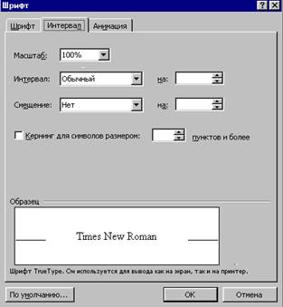 Окно диалога “Шрифт” содержит еще одну вкладку “Интервал”, с помощью которой можно установить межсимвольные интервалы и смещение относительно базовой линии вверх или вниз.