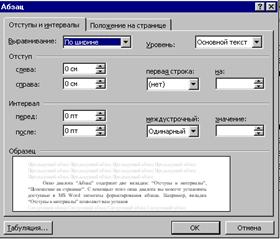 Окно диалога “Абзац” содержит две вкладки: “Отступы и интервалы”, “Положение на странице”. С помощью этого окна диалога можно установить доступные в MS Word элементы форматирования абзаца. Например, вкладка “Отступы и интервалы” позволяет установить следующие параметры формата абзаца: