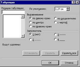 Окно диалога “Табуляция” представлено на рис. Это окно может быть использовано для установки нескольких символов табуляции различных видов. Кроме того, с его помощью можно изменить значение табуляции по умолчанию.