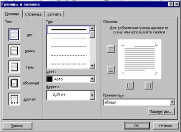 Окно диалога “Границы и заливка” содержит ”, “Страница” и “Заливка”, соответственно. Ниже приведены назначение опций вкладки, “Граница”: