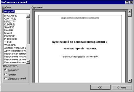MS Word содержит ряд шаблонов (встроенных и, возможно, пользовательских), каждый из которых предоставляет в ваше распоряжение набор стилей для оформление документа. Для удобства использования стили, доступные во всех шаблонах, сведены в Библиотеку стилей, которая доступна через одноименное окно диалога. Данное средство предоставляет вам возможность не только выбрать, но и визуально оценить, как будет выглядеть документ, если вы воспользуетесь тем или иным шаблоном. Все это можно сделать, не покидая окна диалога “Библиотека стилей”. Открытие этого окна осуществляется с помощью команды Формат | Библиотека стилей.