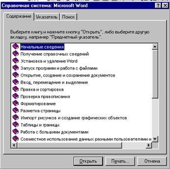 Главное окно справочной системы содержит три вкладки: “Содержание”, “Предметный указатель” и “Поиск”.