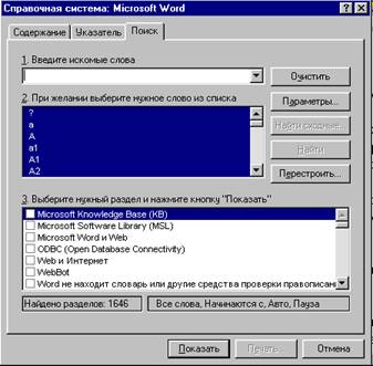 Возможности справочной системы Word для Windows позволяют находить справку по термину или фразе. При этом формируется база данных, содержащая вхождения термина во все Help-файлы. Это расширяет возможности получения справочной информации. Например, при поиске информации по слову “данные” с помощью вкладки “Предметный указатель” вы получите сообщение об отсутствии справочной информации, а при поиске по набору слов вы получите список разделов, в которых встречается слово “данные”.