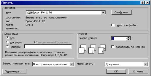 Команда ФАЙЛ, Печать вызывает диалоговое окно «Печать» (рис.2.7), в котором делаются установки для печати документа: