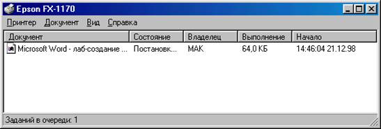 Диспетчер печати имеет управляющее меню, содержащее команды: Принтер, документ, Вид, Справка (по работе с Диспетчером печати).