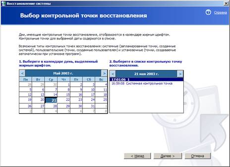 Устойчивые средства защиты системы. Типичным источником проблем в предыдущих версиях Windows было замещение жизненно важных системных файлов их устаревшими или некорректными версиями. Windows XP контролирует эти подмены, сохраняя правильную с точки зрения системы версию файла и одновременно позволяя приложению использовать нужные ему версии библиотек динамической компоновки. Дополнительная защита обеспечивается за счет средств восстановления, в соответствии с рисунком 1, которые следят за системой и благодаря сохраненному «моментальному снимку» системных файлов и настроек позволяют выполнить «откат» к предшествующей конфигурации, если новое приложение или драйвер устройства вызывает проблемы.