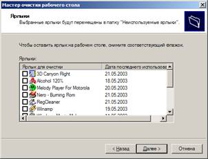 Представляет интерес Мастер очистки рабочего стола. Этот мастер, запускаемый щелчком на кнопке Очистить рабочий стол (Clean Desktop now), отображает список всех ярлыков вашего рабочего стола и дату последнего щелчка на каждом из них (в соответствии с рисунком 3). Можно выбрать те ярлыки, которые больше не нужны, и мастер перенесет их в папку на рабочем столе, которую сам же создаст и назовет Неиспользуемые ярлыки. Таким образом, ярлыки, которыми редко пользуетесь, остаются доступны, просто нужно «копнуть поглубже», чтобы добраться до них. Если же ярлык больше вообще не понадобится, нужно удалить его. Это придется делать вручную, поскольку Windows не может делать предположения о том, что можно удалять «со спокойной совестью», а что еще может пригодиться.