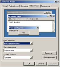 Изменение предопределенных цветовых схем. Для того чтобы изменить одну из поставляемых с Windows цветовых схем (набор параметров, включающий шрифты и размеры некоторых элементов интерфейса), надо открыть диалоговое окно свойств экрана и перейти на вкладку Оформление, в соответствии с рисунком 7. В поле Окна и кнопки (Windows and buttons) выбрать стиль, а затем – схему в поле Цветовая схема (Color Scheme).