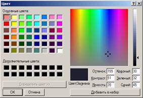 Кнопка Цвет (Color) позволяет указать для любого элемента один из 20 стандартных цветов. Если они не устраивают, нажать кнопку Другое (Other). Windows отобразит диалоговое окно Цвет, в соответствии с рисунком 8. Если не удастся найти нужный цвет в палитре простых цветов, можно определить свой собственный. Цвет, отображаемый в окне Цвет | Заливка, может быть выбран с помощью перекрестья Оттенок/Насыщенность и стрелки яркости или указанием числовых значений. Когда получится тот «колер», который нужен, нажать кнопку Добавить в набор (Add to custom colors). Для замены существующего дополнительного цвета выделить его, прежде чем определять новый.