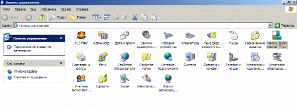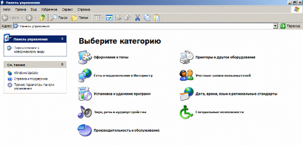 В ранних версиях Windows Панель управления была единой – это был набор ярлыков, позволявших запускать соответствующие средства настройки и конфигурирования. По мере усложнения компьютеров множилось и количество значков в Панели управления, и выросло оно настолько, что вполне может испугать новичка, увидавшего панель впервые. Windows XP решает эту проблему путем разделения Панели управления на категории и улучшения внешнего вида Панели управления (в соответствии с рисунком 16).