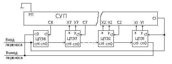 Цифра переноса поступает по общему входу переноса и сдвига вправо с выхода регистра признаков БМУ. Цифра переноса подается в схему ускоренного переноса и в младший разряд младшего ЦПЭ. В данной схеме объединены 8 ЦПЭ для обработки 16-ти разрядных данных. Сдвиг вправо передается сквозным переносом между центральными процессорными элементами. Цифра переноса формируется в СУП одновременно с суммированием операндов в ЦПЭ. Сдвиг вправо из младшего разряда и цифра переноса из старшего разряда старшего ЦПЭ передается на объединенный выход переноса, который соединяется с входом признаков БМУ. Последняя цифра переноса может формироваться как в последнем ЦПЭ, так и в СУП, в зависимости от того, какой сигнал подается на вход разрешение переноса (РП). Если РП = 1, то цифра переноса снимается с выхода СУП, а если РП = 0, то с ЦПЭ.