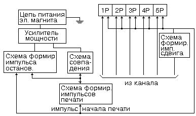 Под действием импульса пуска обесточивается обмотка электромагнита. Якорь отлипает от сердечника, приводя в готовность наборные линейки печати символов. Схема формирования импульса печати формирует импульс печати с длительностью, равной пяти длительностям рабочих импульсов при передаче 5 - ти разрядного кода. Импульс печати подается на схему "И", на второй вход которой подается код символа из регистра. Код символа поразрядно вперед младшим разрядом. Рабочие импульсы, соответствующие "1" открывают усилитель мощности, соответствующие "0" - закрывают, соответственно притягивая или отпуская якорь от сердечника. При этом якорь управляет набором линеек.