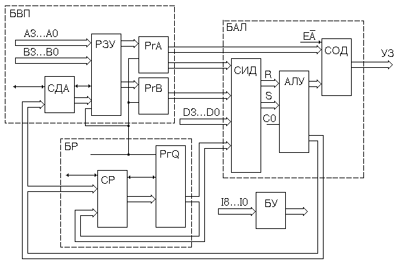 БЛОК АРИФМЕТИКО - ЛОГИЧЕСКИЙ (БАЛ). АЛУ имеет два 4-х разрядных входа R и S. Данные на эти входы поступают с выхода селектора источников данных (СИД). Кроме этих входов АЛУ имеет вход для подачи переноса С0. На вход R АЛУ СИД коммутирует или выход регистра PrA блока БВП или внешнюю шину данных D3 .D0 либо передает на этот вход нулевое значение. На вход 8 СИД коммутируют один из трех источников (PrA, PrB, PrQ) или передают нулевое значение.