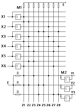 Прожигание программы в соответствии с назначением матрицы состоит в том, что прожигается плавкий предохранитель и транзистор, подсоединяется к узлу матрицы. Если на входы транзисторов подать нули, то они будут закрыты. Матрица М2 называется матрицей дизъюнкции. На ее горизонтальных шинах появляется сигнал в том случае, если снимать сигнал через инвертор.