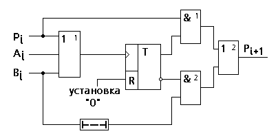одновременно bi опрокидывает триггер в "0". На инверсном выходе триггера устанавливается "1", следовательно на вторую схему "И" подаются две единицы, следовательно на выходе второй схемы "ИЛИ" формируется цифра переноса в старший разряд, равная "1". Если Pi=0, то цифра суммы, которая снимается с прямого выхода триггера, равна "0". Если Pi=1, то сумма Si=1.